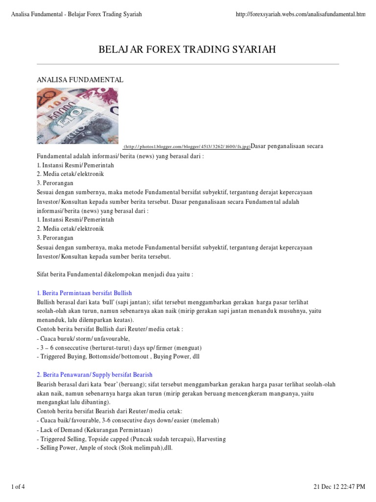 Analisa fundamental menggunakan data ekonomi untuk melihat apa yang akan terjadi dengan mata uang, terutama berita ekonomi yang biasanya sudah dijadwalkan dan akan dirilis pada waktu tertentu, seperti yang ditunjukkan pada kalender forex. Blog ini berisi cara belajar trading forex untuk pemula secara online di indonesia yang mudah dalam bentuk artikel dan video. Sebagai trader forex, dalam menjalankan transaksi membutuhkan kemampuan menganalisa pergerakan harga dan karakter mata uang tertentu dengan baik sehingga bisa menghasilkan keuntungan yang konsisten.khusus untuk investor atau trader forex yang memiliki jangka waktu transaksi yang panjang, dibutuhkan pengetahuan lebih pada jenis analisa fundamental forex.
